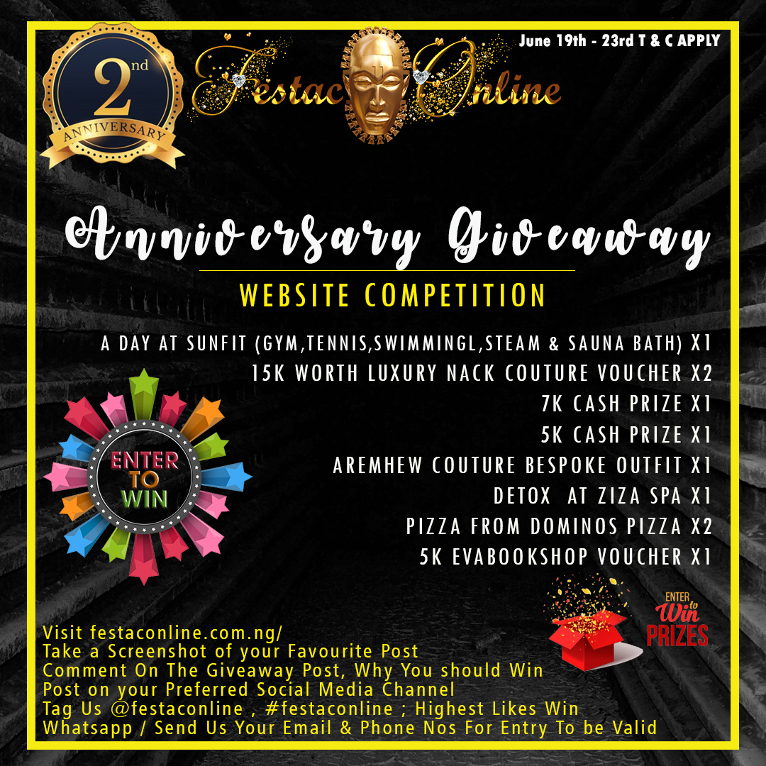 The Festaconline 2nd Anniversary Give-away competition would be run on our social media handles as well as websites.