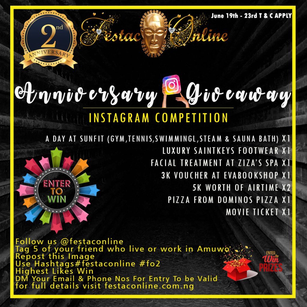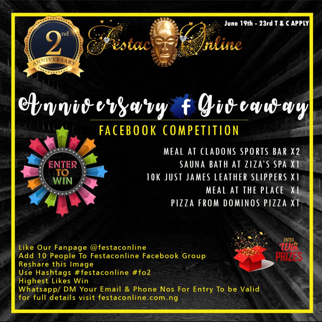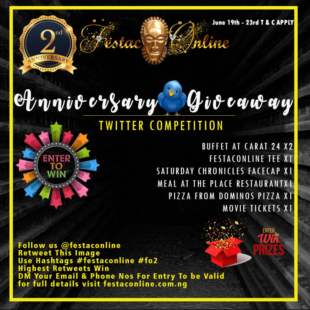 The Festaconline 2nd Anniversary Give-away competition would be run on our social media handles as well as websites.