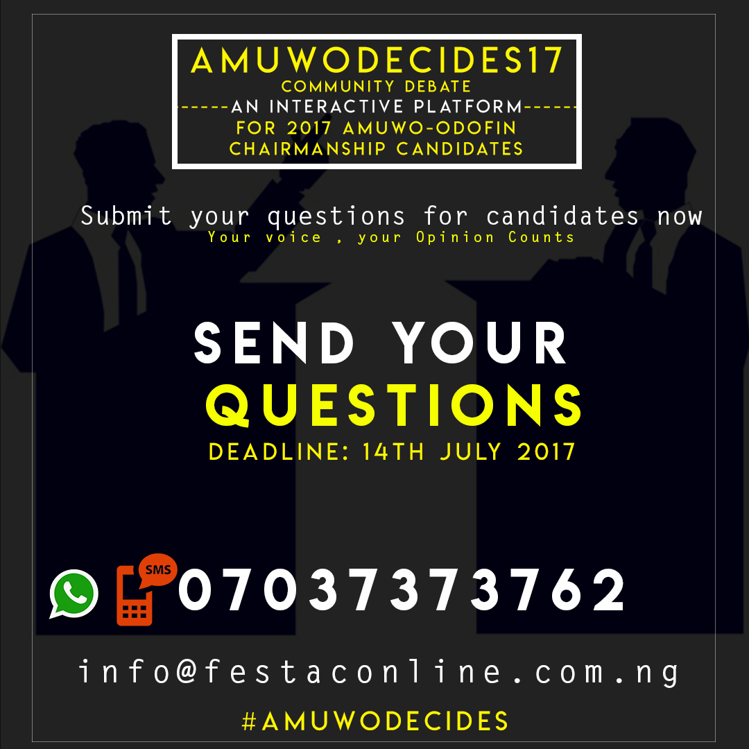 For your chance to be part of the audience and put your question in person to the party leaders, email the question you would like to ask to info@festaconline.com.ng or tweet it using the hashtag #amuwodecides