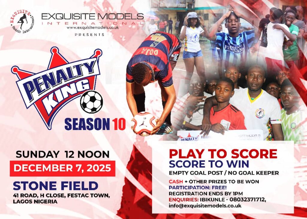 Festac Town is set to buzz with excitement this Sunday, December 7, 2025, as Exquisite Models International brings back its popular football showdown, Penalty King Season 10. The annual event, known for attracting football lovers of all ages, will take place at Stone Field, 41 Road, H Close, Festac Town, Lagos, beginning at 12 noon.