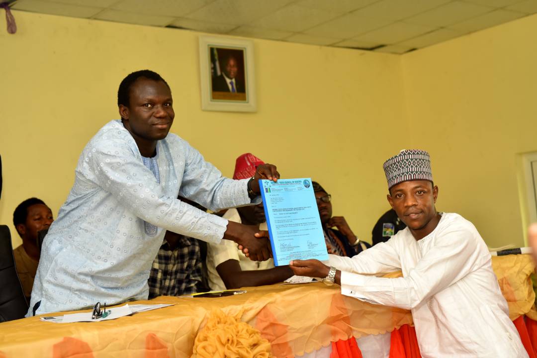 Chairman National Youth Council of Nigeria Amuwo Odofin Local Government of Lagos State Comrade Gbenga Nathaniel Akinbinu Presenting the Budget for the entire Youth of Amuwo Odofin LG to the Executive Chairman of Amuwo Odofin LG Comrade Engr.Valentine Buraimoh today Friday 5th January 2018.